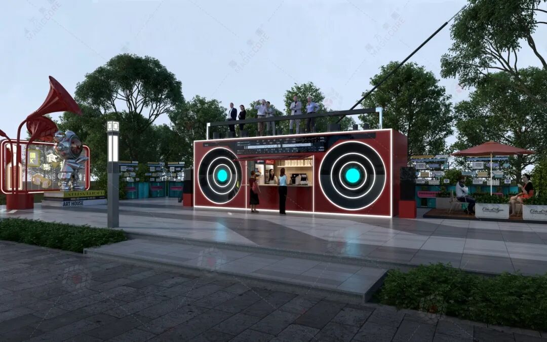 “老收音机里,藏着街巷的新故事”,收音机商铺以复古造型唤醒集体记忆。9m长的机身复刻经典收音机轮廓,瞬间激活城市商圈、景区街巷的怀旧情怀。