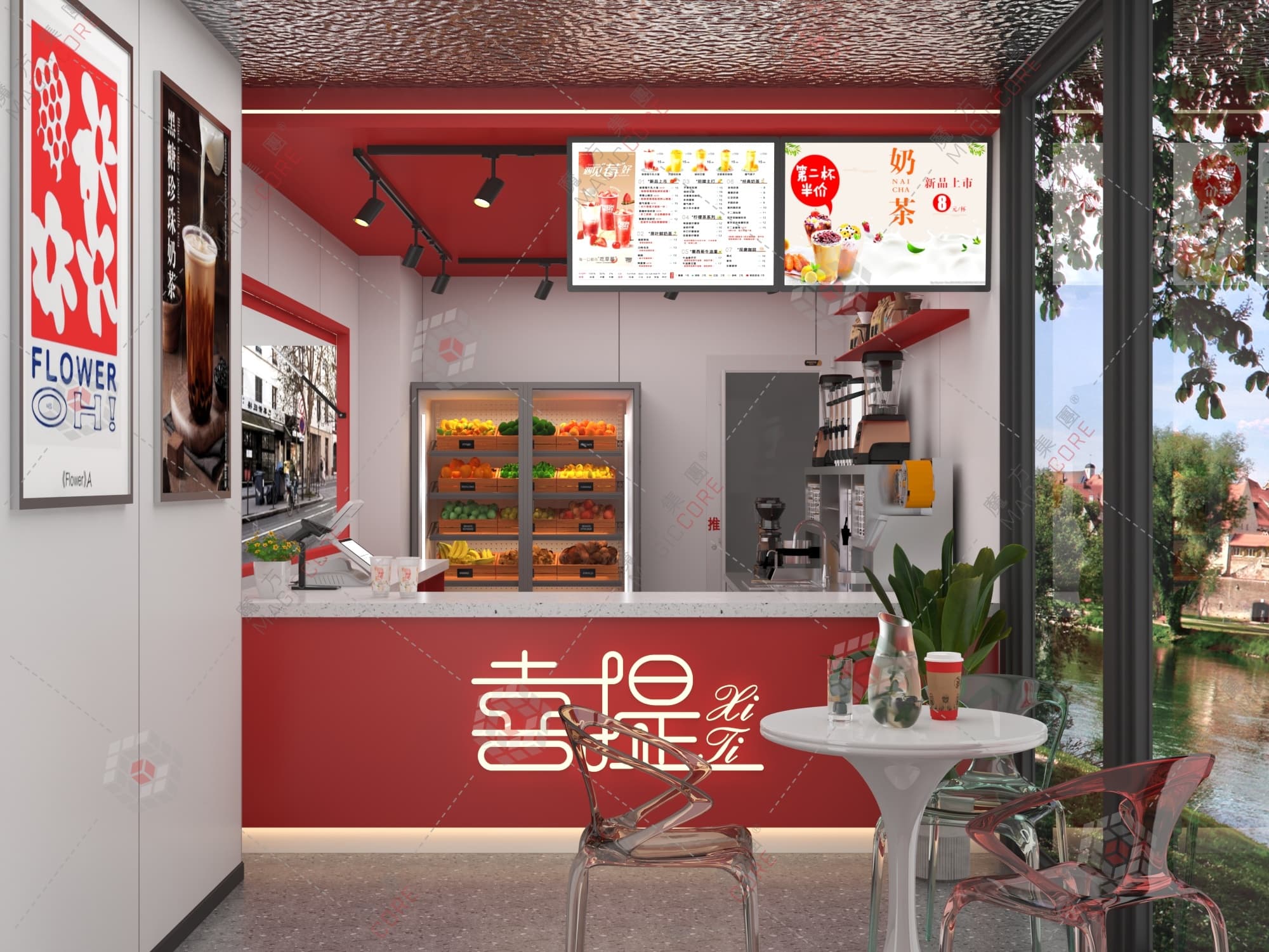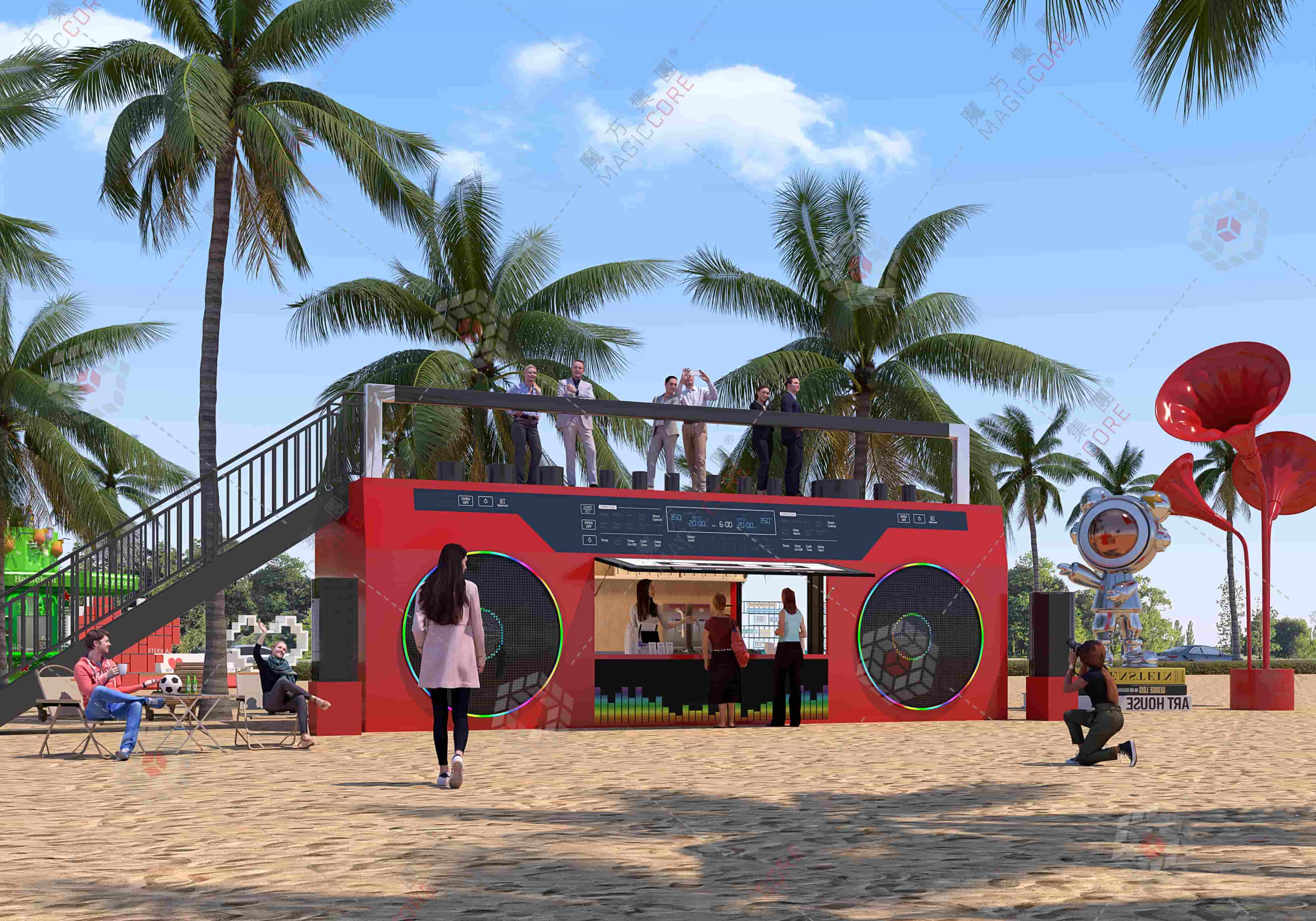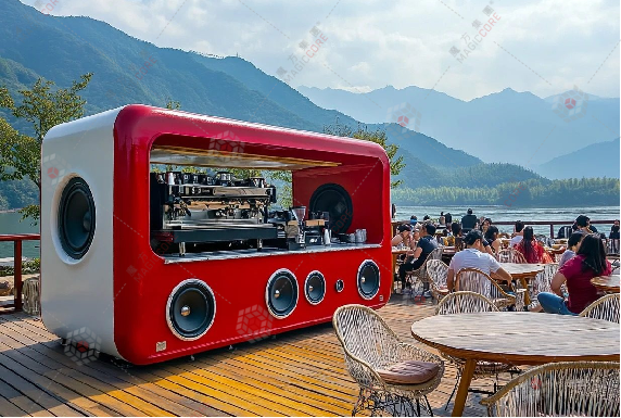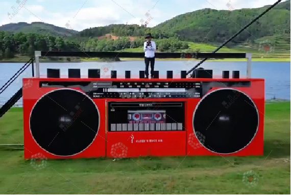 收音机商铺复刻复古收音机经典造型,圆角、天线等细节还原度高,内嵌灯带与主题灯箱丰富夜间辨识度,开放式营业窗口缩短互动距离,适配商圈、景区等潮流消费场景。